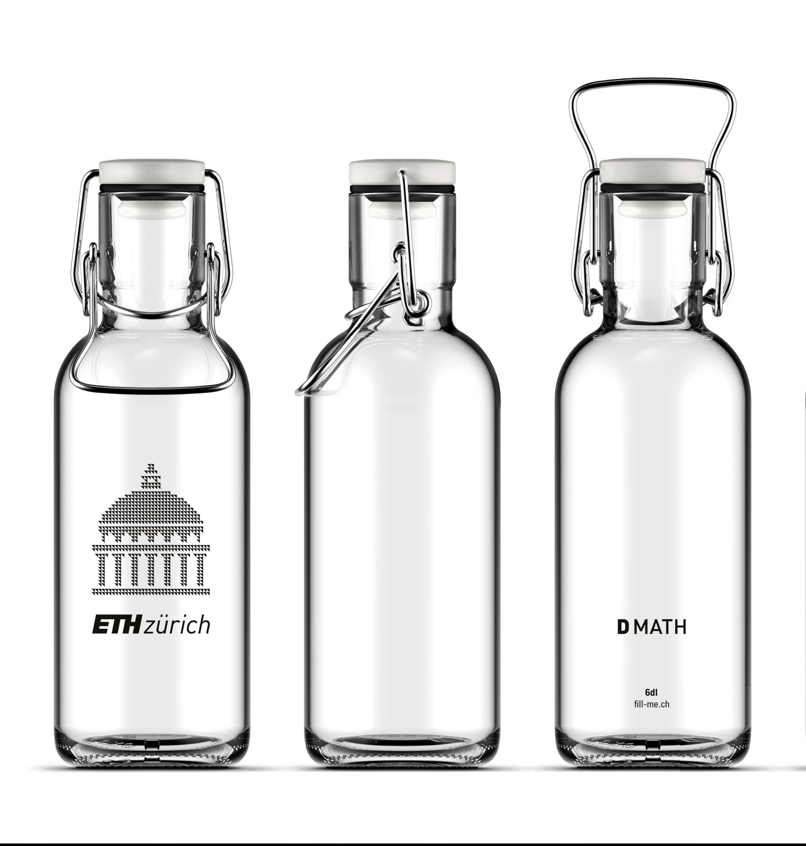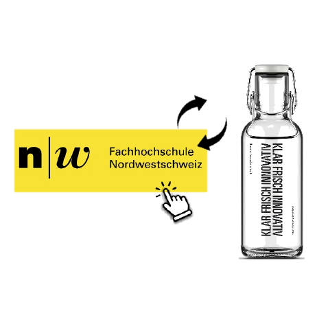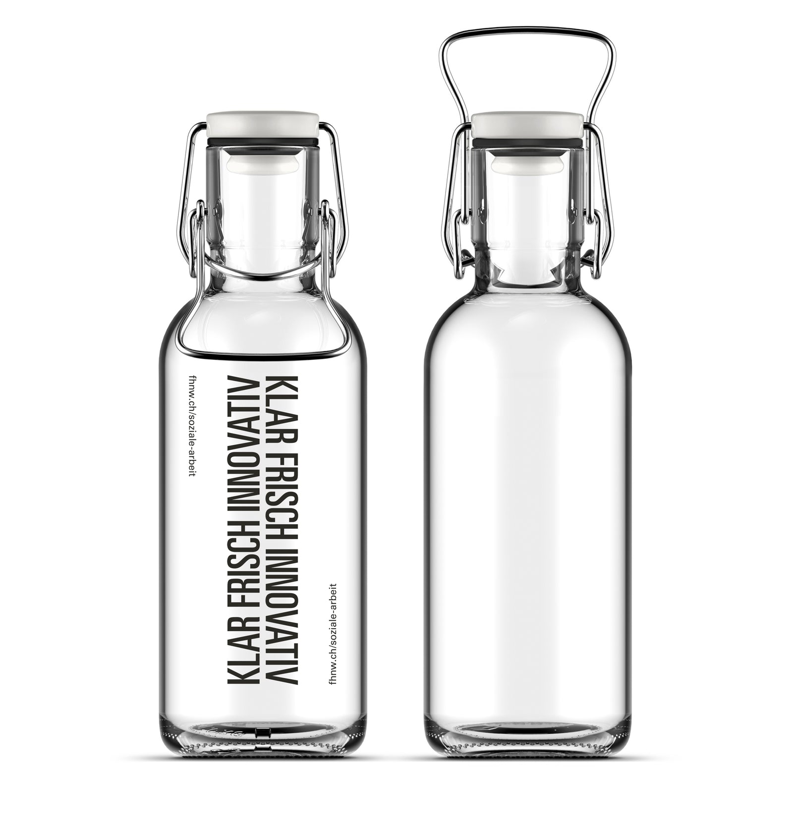 Individually designed FILL ME bottle made of borosilicate glass as a welcome gift with attitude, uniform, high-quality design strengthens affiliation and connection to the institution.